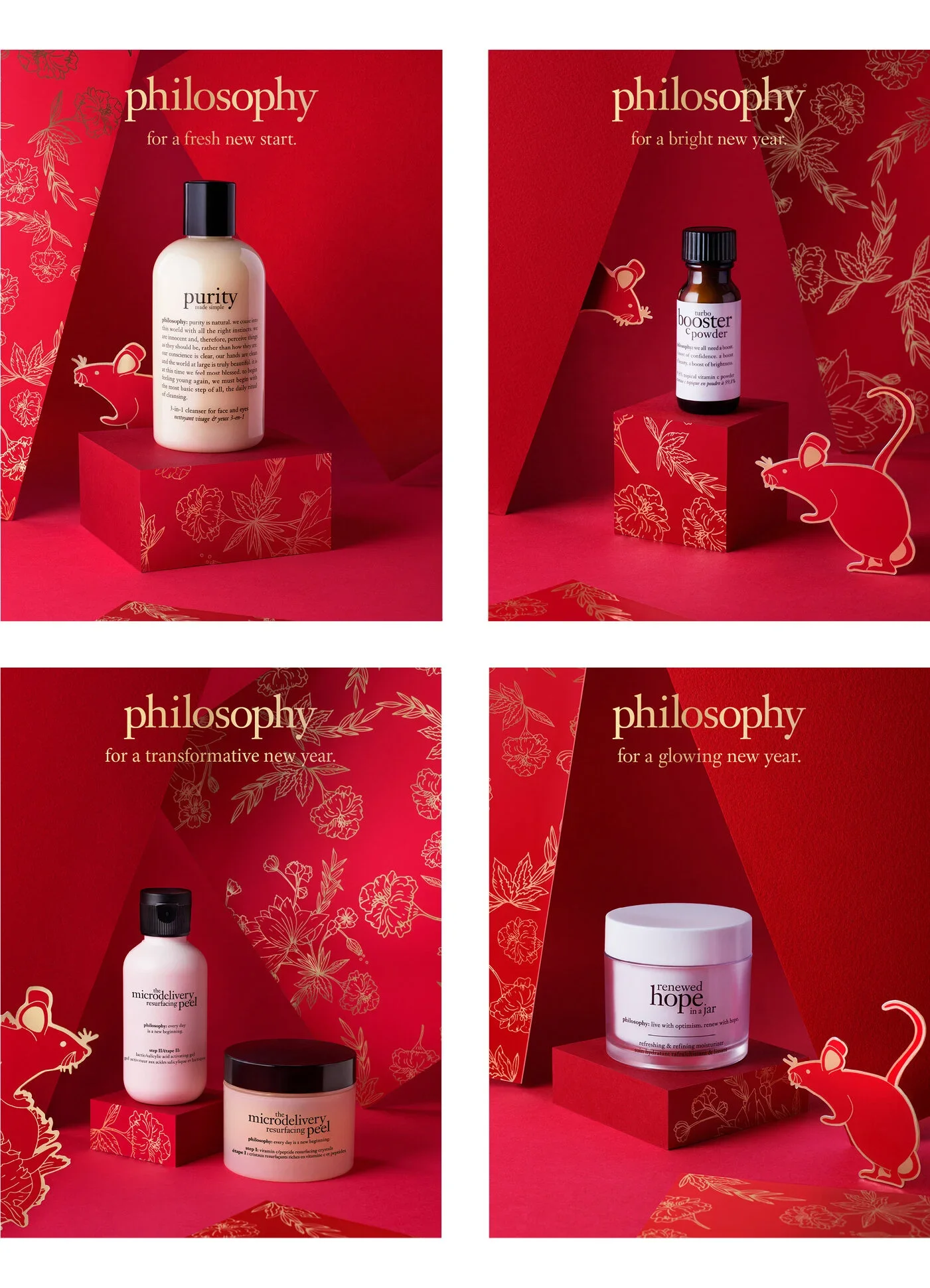 brief: design collateral in support of the lunar new year holiday. inspired by the “year of the rat”, we worked with an illustrator to create our philosophy holiday mascot “phil” the rat and a festive pattern.